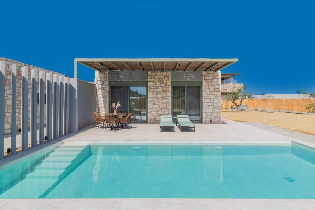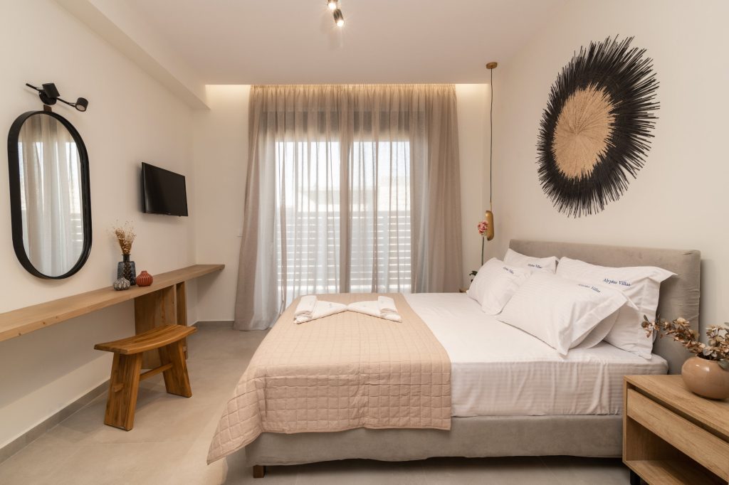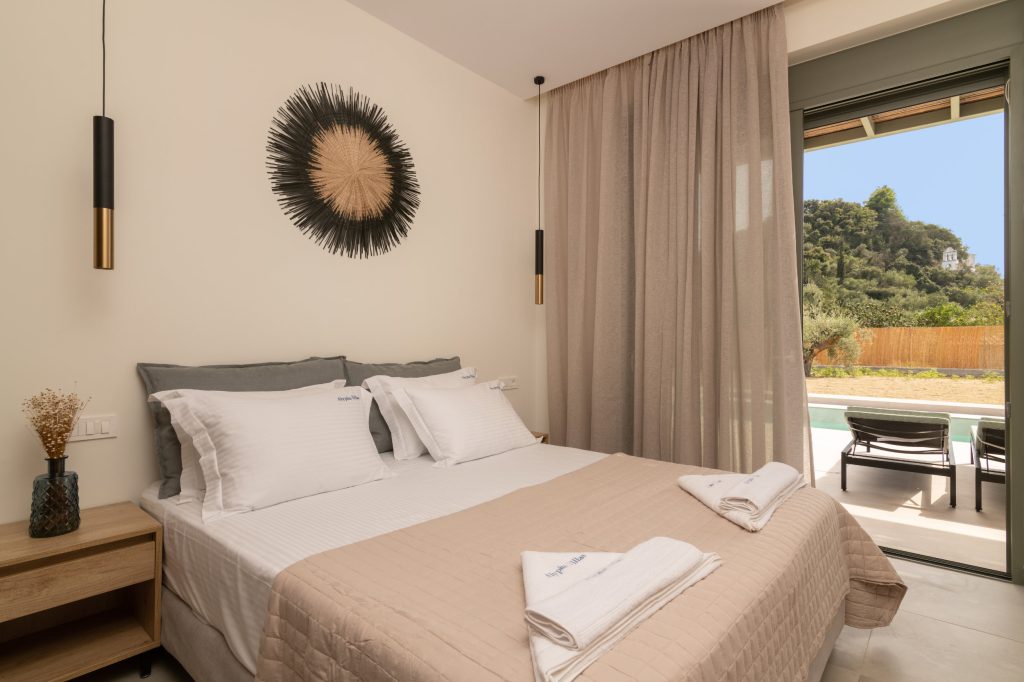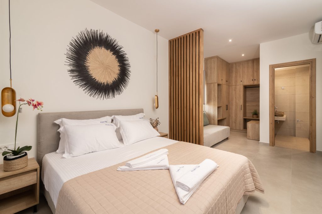 Olea Villa, where tranquility meets luxury in a haven designed for your ultimate relaxation. Olea Villa welcomes up to 4 guests, offering a spacious bedroom adorned with a sumptuous king-size bed and a cozy living room featuring a double sofa bed, ensuring a comfortable stay for all.